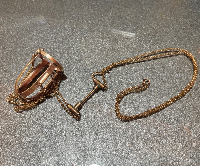 ジェイルはオール真鍮のペンダントです。 身につけるとオーバル状になるチェーンが特徴的。 写真の通り、小瓶が収納できます。 収集した植物、あるいは貴重な採取砂、液体、 何を捕らえて”牢”に入れるかはあなた次第。 本体4cm チェーン長40cm 内径(収納可能瓶内径)2.5cm 真鍮