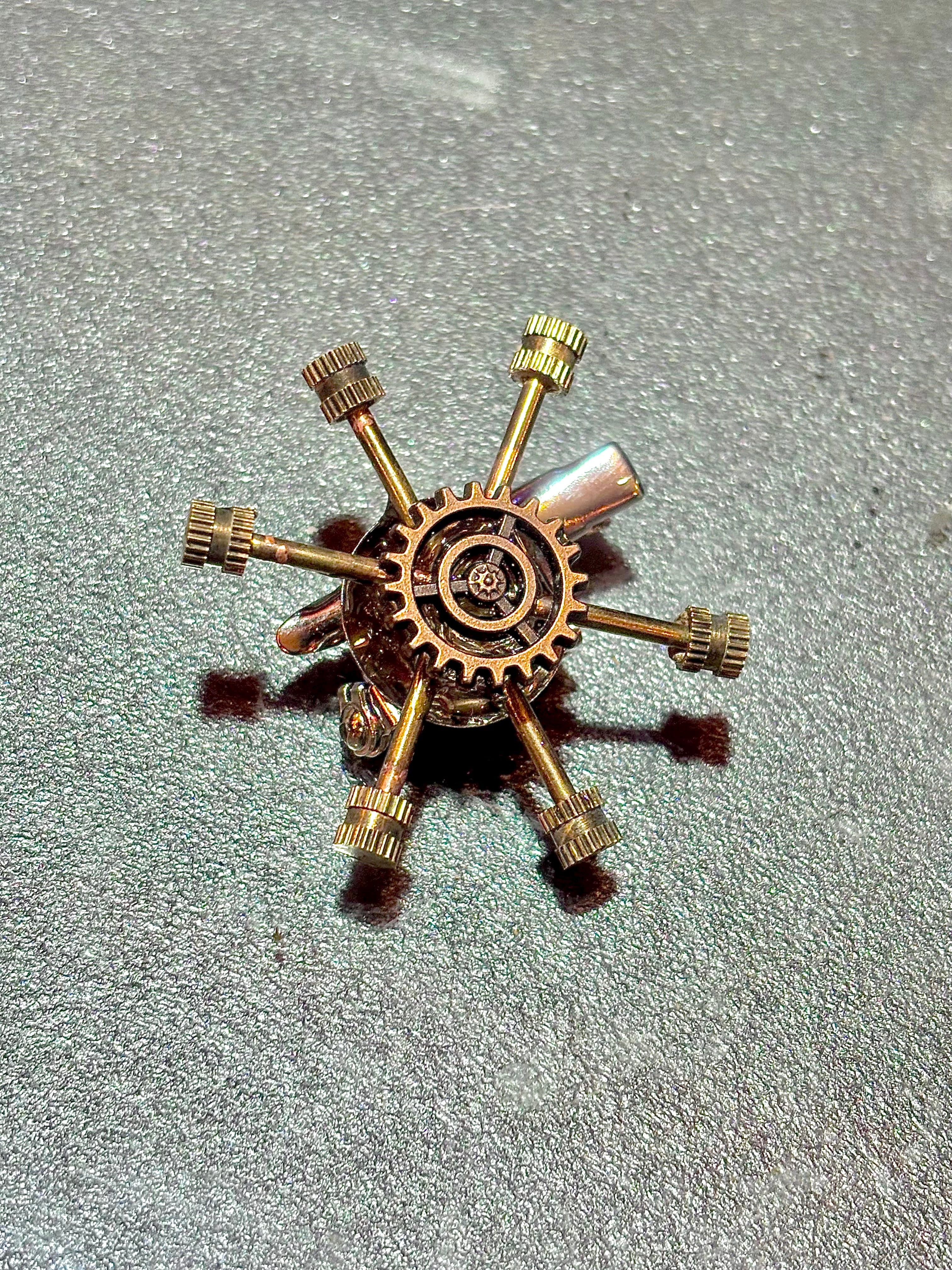 真鍮部分は全てロウ付けにて加工していますが、歯車部分はバーナーの熱で溶けてしまう素材のため、接合としてレジンを使っております。ご了承ください。