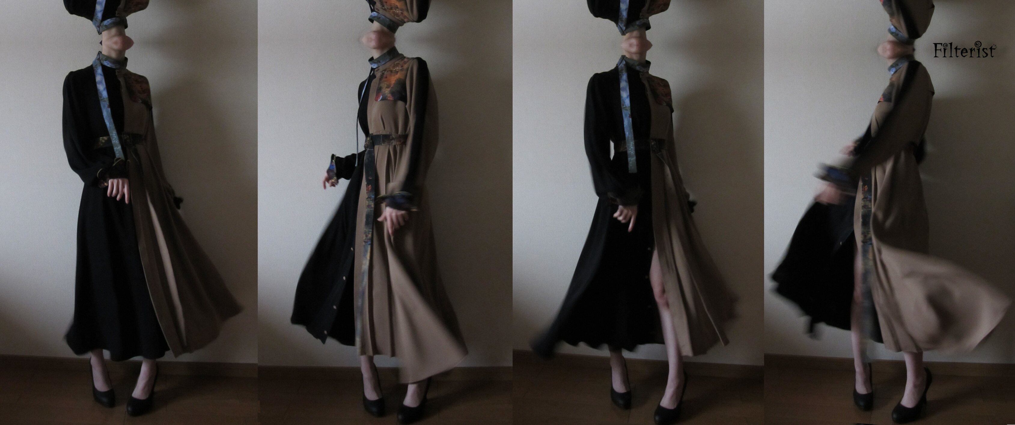 -Beige/Black/柄 × エキセントリック- ガンパッチ風ヨークとベルト部分にオリジナル柄生地を使用した、ちょっとエキセントリックなツートンカラーワンピースです。