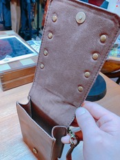 ベルトバックルとビーズをあしらったレトロな印象のポーチです。