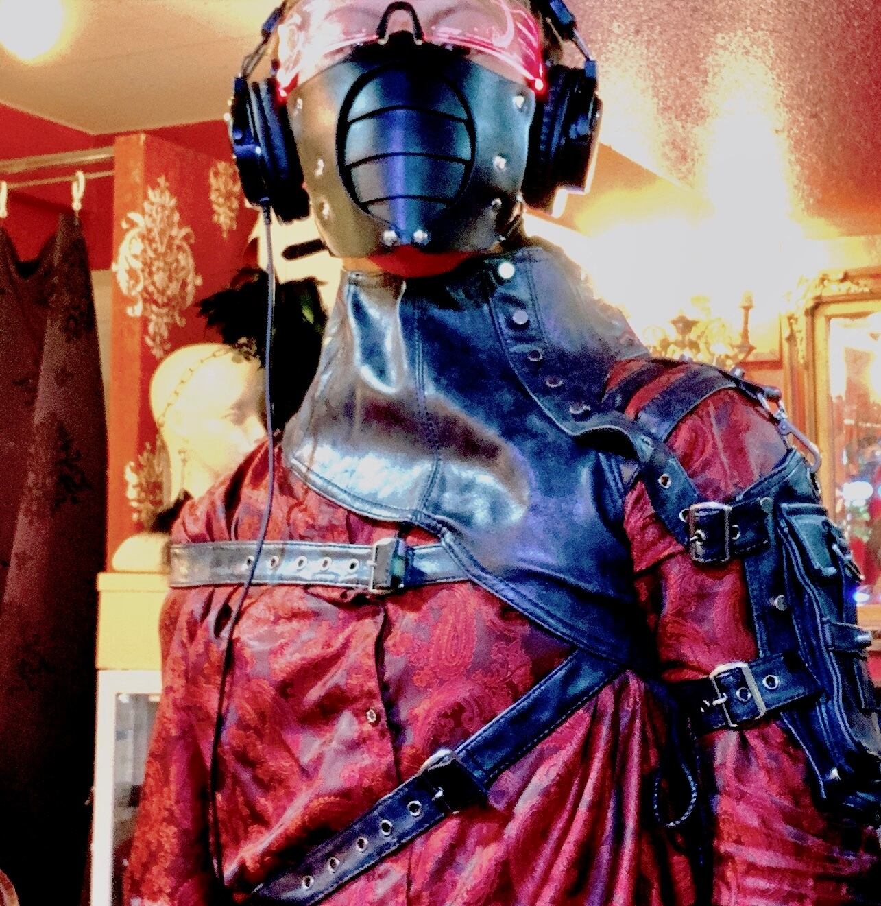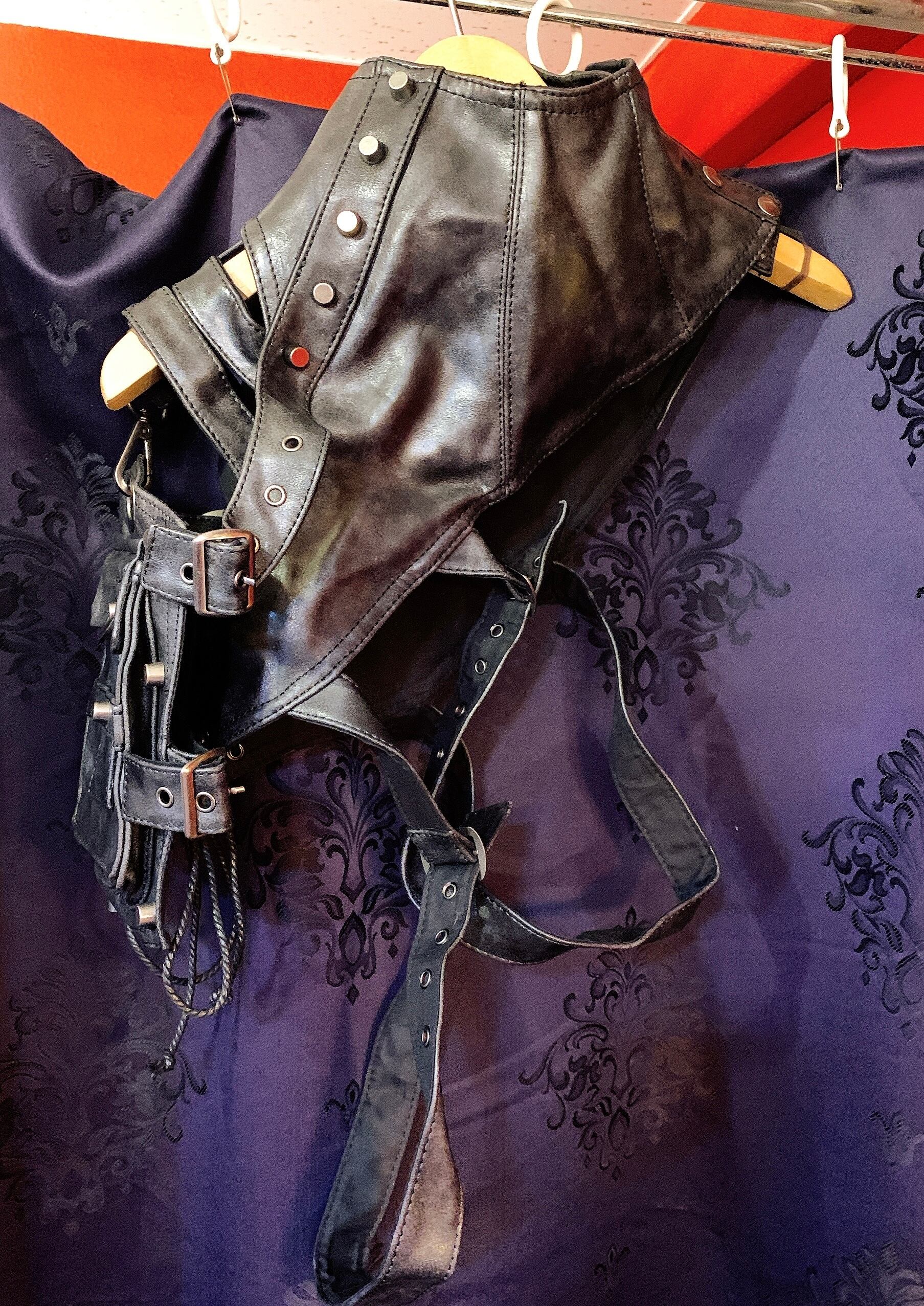 しっかり重厚感あるハーネスを纏い、ゴスや黒系バーレスクドレスに合わせる首回りオプションとして。